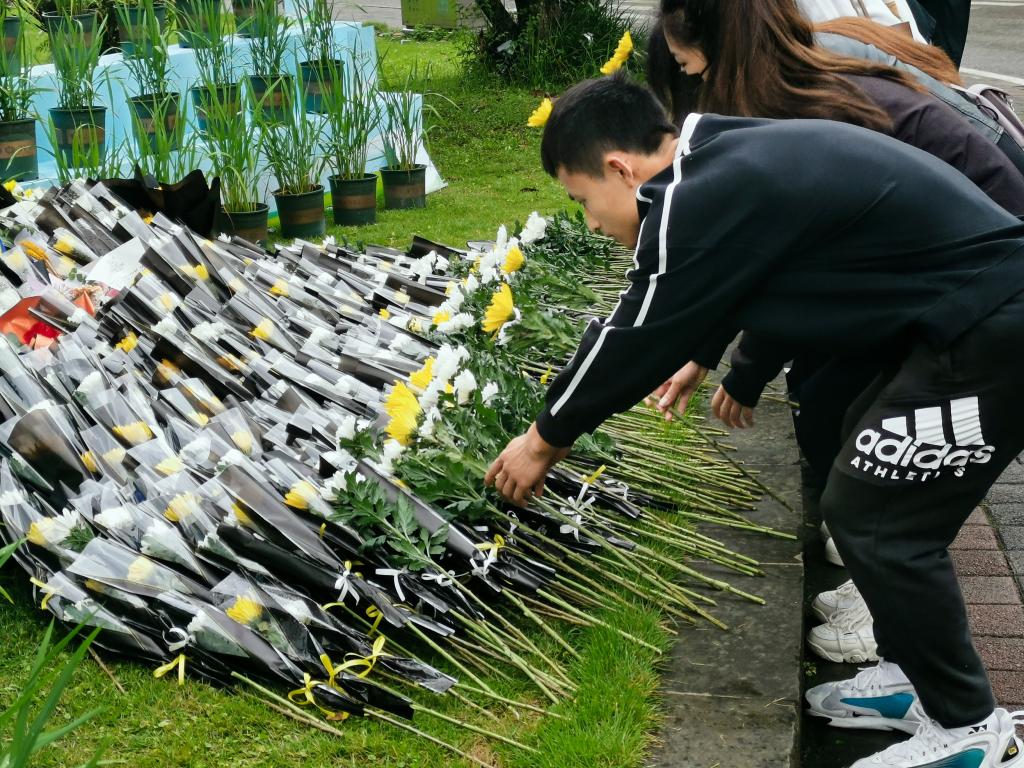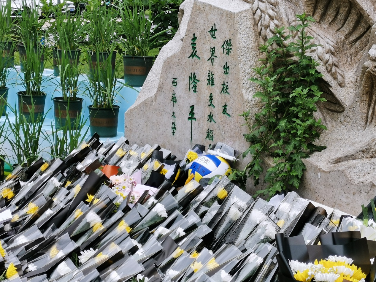 沾满雨水的鲜花丛中放了一副泳镜和一个排球,游泳和排球是袁隆平院士生前最喜欢的两项运动。体院学子用体育人的方式,对这位心怀体育报国梦,视体育运动为终身爱好的老学长表达最真诚的敬意。