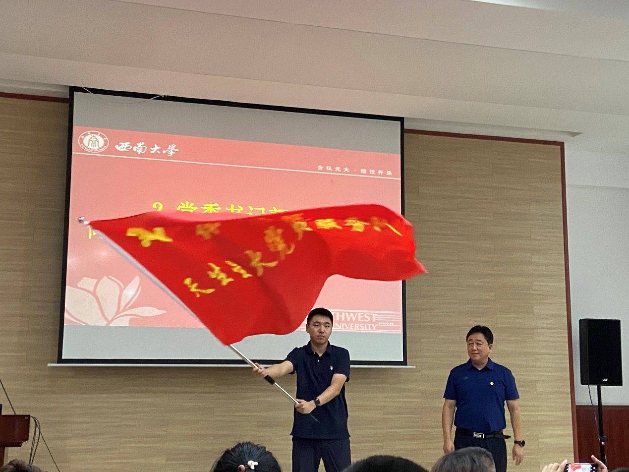 第一阶段,学院领导为天生星火党员服务队举行换届仪式。院长黄晓灵宣读天生星火党员示范班和服务队组织机构名单,党委书记郭立亚向天生星火党员示范班班长、服务队队长刘新授旗,刘新发表接旗感言。