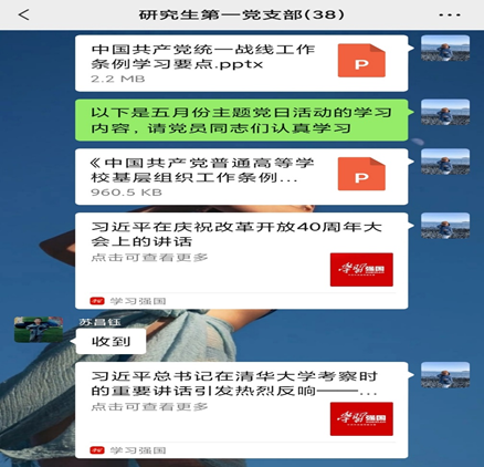 此外,研究生一支部全体党员线上学习了《中国共产党统一战线工作条例》、《中共共产党普通高等学校基层组织工作条例》,回顾了习近平总书记在庆祝改革开放40周年大会上的讲话内容以及习近平总书记在清华大学考察时的重要讲话精神,在学习党史,歌颂党史和伟大祖国的同时,增强并坚定信念,学习相关条例,夯实理论基础。