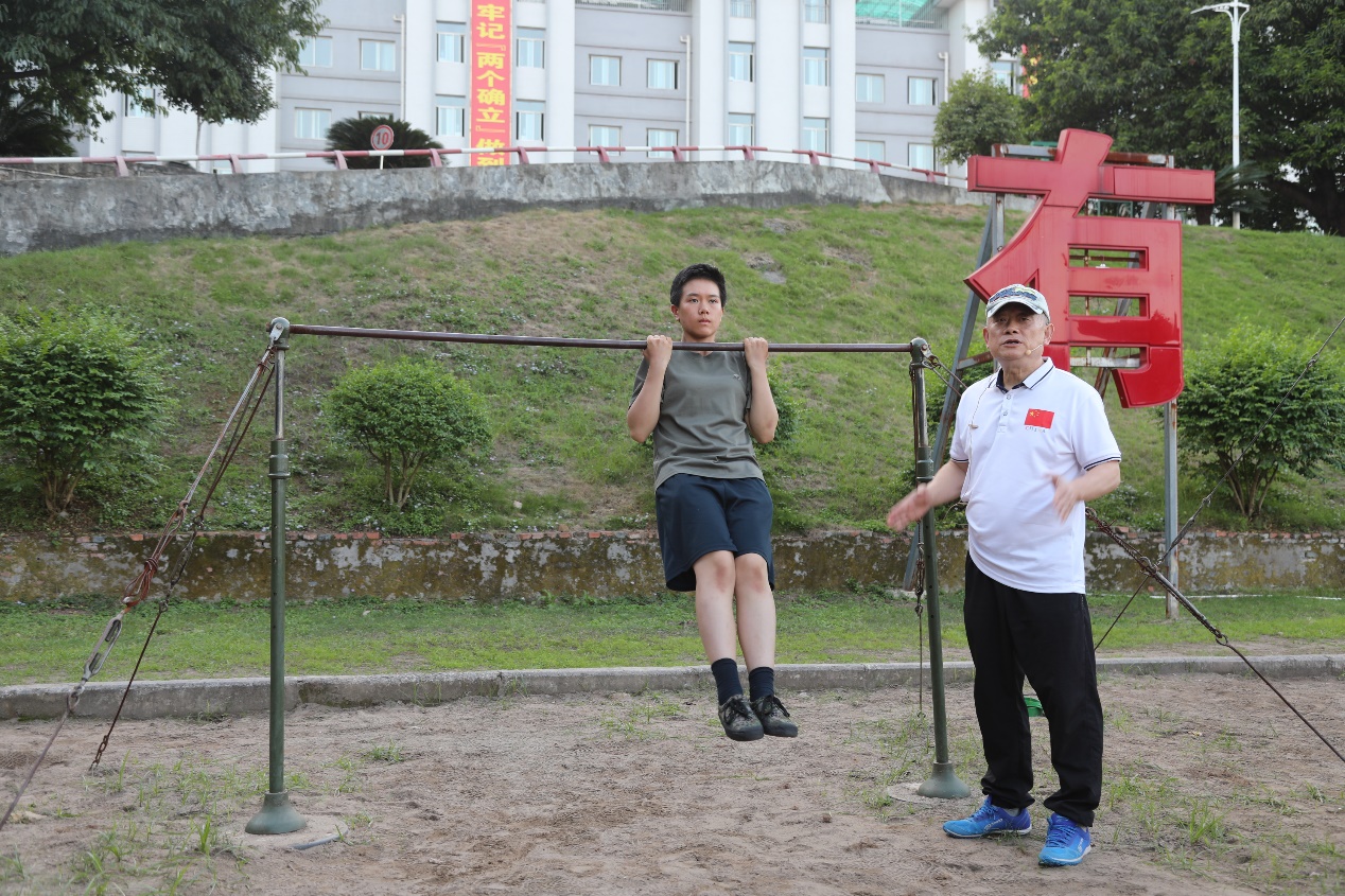 体操专项彭远志老师则针对官兵体能考核中单双杠项目,分享自身多年执教经验,将课堂教学与军事科目训练相结合,对官兵存在的问题进行专门指导,体操专业的学生配合进行动作示范与训练辅助。