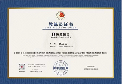 在培训考核结果公布后,为通过考核的学员颁发中国田径协会《D级教练员》证书,该证书唯一官方防伪查询平台为“中国田径”App(中国田径协会官方App)。